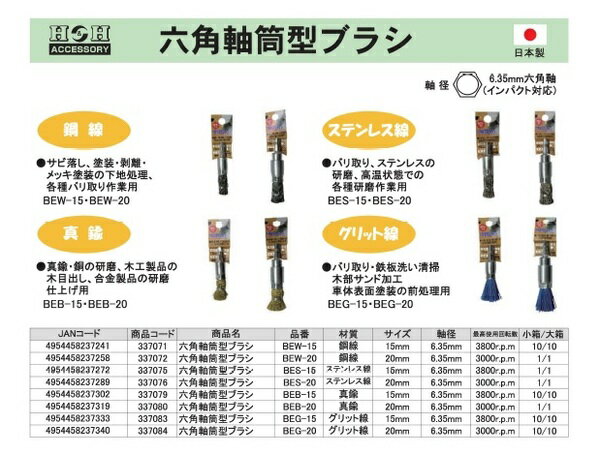 (業務用25個セット) H&H 六角軸筒型ブラシ/先端工具 【塗装前処理用/15mm】 グリット線 日本製 BEG-15 〔DIY用品/大工道具〕